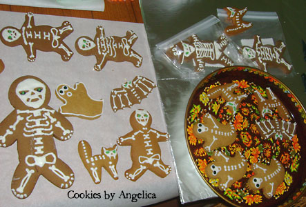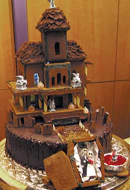 July 18, 2008 I received a photo of Lisa Simpson's Cookie Phantom Manor. Spectacular, Lisa! ![]() December 14, 2007 Gingerbread Season I received two more submissions of completed Phantom Manor gingerbread houses based on my free pattern and instructions, found here. First, here is Patricia's haunted Phantom Monor cookie house. Patricia is married to Antonio Hoyos, who works with magician Kevin James, and in fact, appeared at Universal Horror Nights. Patricia's creepy confections includes a detailed cemetery, ghosts, pumpkins and icing vines climbing up the outside of the house. ![]() ![]() I love the icing designs on the skeleton cookies (created by Patricia's daughter Angelica)! ![]() I also received photos from Marci in Alabama. Her Phantom Manor is ready for Christmas! Beautiful job Marcia! Your icing rails are awesome! Orginally, I hesitated to include Gingerbread Dimensions as part of this site, but I am very glad I did! I'm delighted by the enthusiasm and creativity put into the cookie creations I've seen! October 22 , 2007 Recent Project Submissions < /span>Look at this beautiful wedding cake designed for the wedding of fellow Doombug, Brianna . She used my demon wallpaper stencil to airbrush the design on to her "'Til Death Do Us Part" cake. "Brianna writes, "Thanks again, your stencil made my dream cake a reality! :)" AWESOME! November 4, 2007 Creepy Cookies! I r eceived photos of two more beautiful Cookie Phantom Manors. Paul sent me this photo of his creation. He tells me that had a few minor problems in the construction due to the behavior of the dough, but he made a wondeful recovery! The pumpkins are marzipan and he also created a cemetery with meringue tombstones. ![]() Kathy from Idaho sent me this photo of her bewitched baked goods. She said that they can't wait until Christmas, so they can do another! ![]() December 23 , 2006 Tis the Season...for Gingerbread: Part 2 Scott and Maggie, from Las Vegas, created a web page describing the creation of their Christmas gingerbread Phantom Manor, based on my templates. ![]() They did a beautiful job and made clever use of candies and frosting. They also included a full moon, and one of my favorite details, the hitchhiking ghosts printed on transparency film! To see more photos, check out their site http://fyreworks.net/gallery/hm_gingerhouse/ Thanks, Scott and Maggie! Your results are terrific! December 12 , 2006 Haunted Wedding Cake Reen, from Seattle, sent me an email de scribing her creation of this Halloween themed wedding cake, which featured a gingerbread Phantom Manor based on my templates. ![]() The house had golden sugar windows, and was lit by a small light inside, to give the windows an eerie glow. A beautiful spider cake, with licorice spiders, accompanied the Phantom Manor cake. The cake also features a gingerbread cemetery, a skeletal bride and groom, and a rasberry sauce "fountain". The creation of this cake was not the only amazing feat. Reen also had to transport it from Seattle to Portland! Thanks for sharing this, Reen! I'm sure this is one cake that the wedding guests will long remember and I'm thrilled to have been able to contribute a little to it! Of course, it was your talent that made it such a success! November 8, 2006 I received this photo from Marian, from Suffolk, England. Her son asked to have a haunted gingerbread house for his birthday, and Marian created this beauty using my Phantom Manor Cookie House templates (note the birthday candles). The house is partially supported by a black cardboard box, and she cut out the window openings and drew spook y eyes on the cardboard, peering out. Thanks for sharing this, Marian! Fantastic!