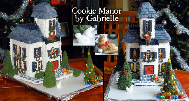 Beijing Baking! October 10, 2009 December 29, 2008 Haunted Gingerbread Sherry writes, "This was for a display piece at a charity event. It was lit with Floralights on the inside and purple spotlights from a craft store on the outside. (I hid them in Rice Krispie bushes.) The lighting gave it a great eerie effect. Everything was edible except for the wire frame the tree was based on. I made the house from chocolate cookie, decorated with Golden Graham cereal, gelatin sheets (broken up to look like “cracked” windows), pulled sugar, wafer cookies, a bit of SugarVeil for the spider webs, tons of royal icing, burnt sugar and candy embellishments." Wonderful job, Sherry! I love the pulled sugar details, and the green Rice Krispie Treat bushes are a great idea! Fantastic details! Sherry has a cake and dessert business in Suffolk County, Long Island, New York. Check out her site! A CAKE IN TIME (When it's Time for Great Cake!) A Christmas Manor Gabrielle writes, "Thank you so much for posting your pattern for your haunted cookie manor! It looks fantastic as a Christmas gingerbread house! It was a lot of fun to make!!!" Check out the little white bunny in the yard and pup on the front step (insets) It is lovely, Gabrielle!