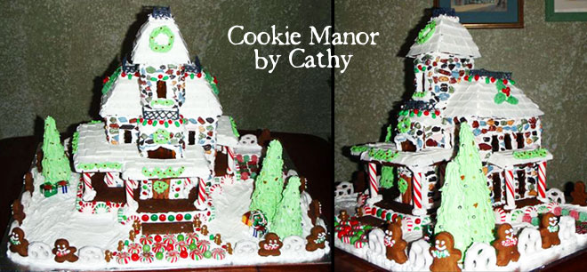 December 23, 2008 Mmmm, White Frosting Snow! Cathy sent these photos of her wonderful Gingerbread Manor with lots of gingerbread people. Lovely job, Cathy!