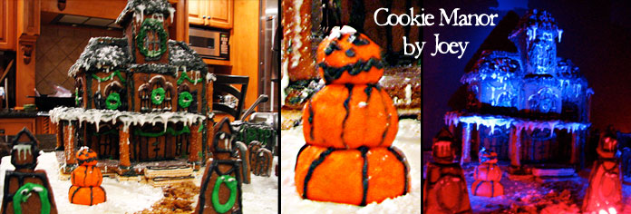 A Christmas Phantom Manor The first Cookie Phantom Manor photos have been submitted! Jan, from the San Francisco Bay Area sent me a batch of photos of their Cookie Phantom Manor! Jan says that if it collapsed, they would have just claimed it was due to an earthquake. Excellent job! I was thrilled to see a success! Thanks for the photos Jan! I hope it adds to your fun this Halloween! ![]() Email me at haunted3d@raykeim.com |