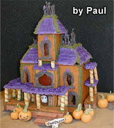 December 5, 2008 Grand Prize! Tony, from Liberty South Carolina sent these photos of his GRAND PRIZE winning gingerbread manor! "This gingerbread house took me one month to complete but it was worth every minute" ![]() ![]() Fantastic, Tony!!! November 29, 2008 Cookie Phantom Manor on YouTube Joey, aka M.Gracey (from Master Gracey's Haunted Mansion blogspot), sent photos of his beautifully constructed Cookie Phantom Manor. Joey writes, "After a long painful 3 weeks I Finally Finished my Cookie Phantom Manor! It took this long because My dog Ate the WHOLE THING! I decided to make it out of Gingerbread because classic christmas feel (and taste).I put the "man eating wreath" on the tower window. I also put the shadow of the phantom in one of the windows and made the "nameless tomb" like the actual attraction." Actually, we had a dog eat one of our gingerbread houses too! Fortunately it AFTER we won the competition! You did a great job, Joey! I love the pumpkin "snowman" too! ![]() Here is Joey's YouTube photo log of the process. Be sure to check out Joey's blog. Link is below. ![]() November 13, 2008 First, Jmsbaum writes, "Hi Ray. BOY what a CALLANGE. I had to use WAY more than 3 tubes of cookie dough, more like 7 and a half tubes....LOL.......And it took me almost 2 weeks to finish!" Thanks for sharing the photos! It looks great! Despite your cookie dough supply issue, I hope you enjoyed making it and that others appreciated it! ![]() And Claudia writes, "I have been a fan of yours since last year when I saw the haunted house cake that you made for your daughter's birthday. We are having a "Haunted Gingerbread House" competition where I work and I used your Phantom Manor as inspiration for the house that I designed. I am attaching a picture of the house I created called "Sally Manor: FYI, I work at the corporate headquarters of Sally Beauty Company. Hope you like it.." It's very cute Claudia! I hope you won! ![]() Donna from Saskatchewan sent these photos of her TWO beautiful Phantom Manor cookie houses! One of them has lights! ![]() Vinny writes :"When I saw your haunted house I had to do my interpretation of it. I made my own cookie dough, used wafer cookies instead of pretzels and made the pumpkins with orange food color, Marzipan and black icing. We gave it t o my daughter’s school, they went nuts." Just wonderful, Vinny! Your daughter must have been a celebrity after that day! I love the ghost and tombstone cookies too! November 9, 2008 Another for Charity Blair created a beautiful gingerbread version of the Phantom Manor cookie ho use for a United Way Halloween Cooking Contest. Blair writes "I made the windows out of caramelized sugar and my husband lit it up for me “maglite” bulbs. Instead of the sugar cookie dough, I made gingerbread based on the gingerbread recipe that I use at Christmas time. I used a glue recipe that I use for my gingerbread recipe as well that dries clear, for all the joints. I also omitted the side porch and the dormers on the roof. All in all, I was pretty pleased with the outcome." Beautiful details, Blair! Congratulations! Karma in Cookie Dough People are always asking me why I offer my models and projects for free. Besides my philosophy of sharing the wealth when I can, I have been rewarded MANY times over by receiving email from people who have taken so much joy from my projects. Hobbyists and fans are always telling me how much they enjoy the projects, which makes me very happy. But I also hear from schools and hospitals who use my projects to enrich and teach, and I've heard from many people who are physically challenged or convalescing , who use my projects as therapy. They become so much more than paper models or cookie houses! This brings me to an email and photos I received yesterday from April in Toronto. April writes:"Hi there! I wanted to thank you for the templates for your haunted gingerbread mansion. This week is the United Way Campaign at work. The United Way is sort of like an umbrella charity organization and they do a huge drive every fall for donations. Most of the offices in the downtown core participate and the funds go to the member organizations under the United Way umbrella (which include charitable organizations for everything from abused women's shelters, children's programs, new immigrant services, soup kitchens and everything in between). Every year our office holds raffles, games and a bake sale as well as several other activities. I baked up your mansion for the raffle. It is my first gingerbread house, I never start small, so I was very happy with how it turned out. It had to be carried into the office on the commuter train so I wasn't able to do some of the things I wanted for fear that they would break off before I got here. I made WAY too much dough, so I will be making another house for next week, which I will drop off at a shelter for abused women and their children in my neighbourhood. I hope you enjoy the pictures as much as I enjoyed making the house. It was a lot of fun!!" ![]() Um...I'm speechless. Such love and dedication. April, you are a gift!!! Thank you! October 19, 2008 Beijing Beau ty! MaryKay, who currently lives in Beijing, China, sent me photos of her fantastic Phantom Manor Cookie House! MaryKay and her 8 year old daughter Karen created a photo log showing all of the stages of construction. Their version includes interior lights! MaryKay writes, "Yes, we're really in Beijing. Part of the reason we really get into the holiday is because, as you note, while living overseas, if we don't create our own island of Halloween, our children won't get to experience these fun traditions we had as kids." MaryKay, I'm am very glad that the Phantom Manor cookie house is part of your Halloween Island!